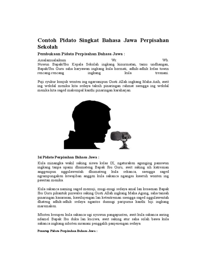 Contoh pidato bahasa jawa perpisahan sekolah yang singkat padat dan jelas untuk acara perpisahan sekolah baik siswa maupun guru sangat coco. Contoh teks pidato bahasa jawa singkat lingkungan sekolah. Lantaran pidato pentingnya pendidikan karakter dalam bahasa jawa menika kita kedah mangertosi kados pundi kaliyan bangsa kita sedaya? Pidato bahasa jawa tema kemerdekaan 17 agustus arina bevin. Pidato merupakan salah satu materi dalam pelajaran bahasa indonesia yang pernah kita pelajari saat masih duduk dibangku sekolah, biasanya di bangku smp yakni ketika kelas 9.