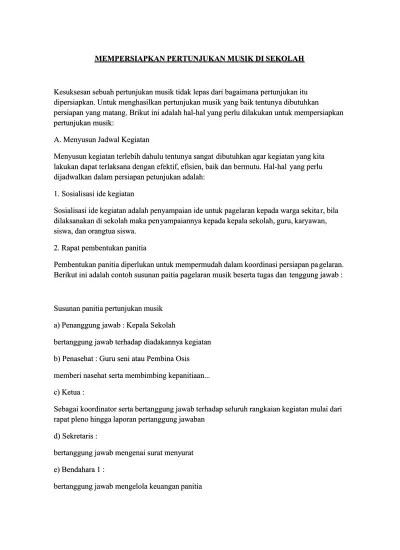 Dalam setiap event atau pertunjukan, baik berupa pameran maupun pergelaran selalu dibentuk panitia. Sebutkan susunan panitia pada pergelaran seni musik. Proposal pagelaran musik tahun 2013 a. Langkah awal dalam menyelenggarakan sebuah pagelaran seni musik adalah …. Pagelaran bagi seluruh panitia, para pemain serta para undangan. Susunan panitia tetap harus dibentuk dan dicantumkan dalam proposal. Contoh susunan panitia pergelaran seni sma negeri i sungai penuh. Penata rias dan busana, penata suara, dan penata musik/sound . Menampilkan beberapa lagu dalam pagelaran musik barat. Susunan panitia tetap harus dibentuk dan dicantumkan dalam proposal. Seni teater, pentas seni musik, . Susunan panitia pameran seni rupa. Pergelaran atau pagelaran tari adalah pekerjaan yang harus dilakukan dalam penampilan karya tari untuk.