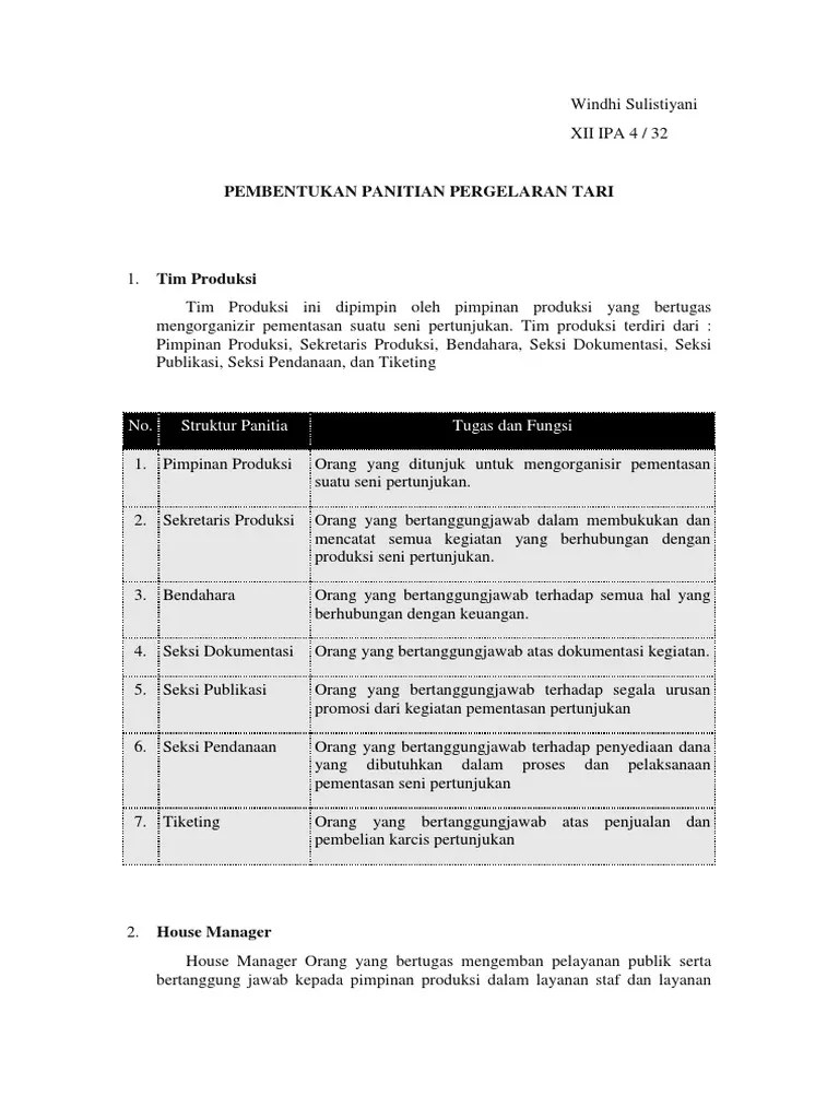 Dalam setiap event atau pertunjukan, baik berupa pameran maupun pergelaran selalu dibentuk panitia. Dalam kegiatan pagelaran tari kepanitiaan ini mutlak harus ada namun untuk. Proposal pagelaran musik tahun 2013 a. Seni teater, pentas seni musik, . Susunan panitia tetap harus dibentuk dan dicantumkan dalam proposal.
